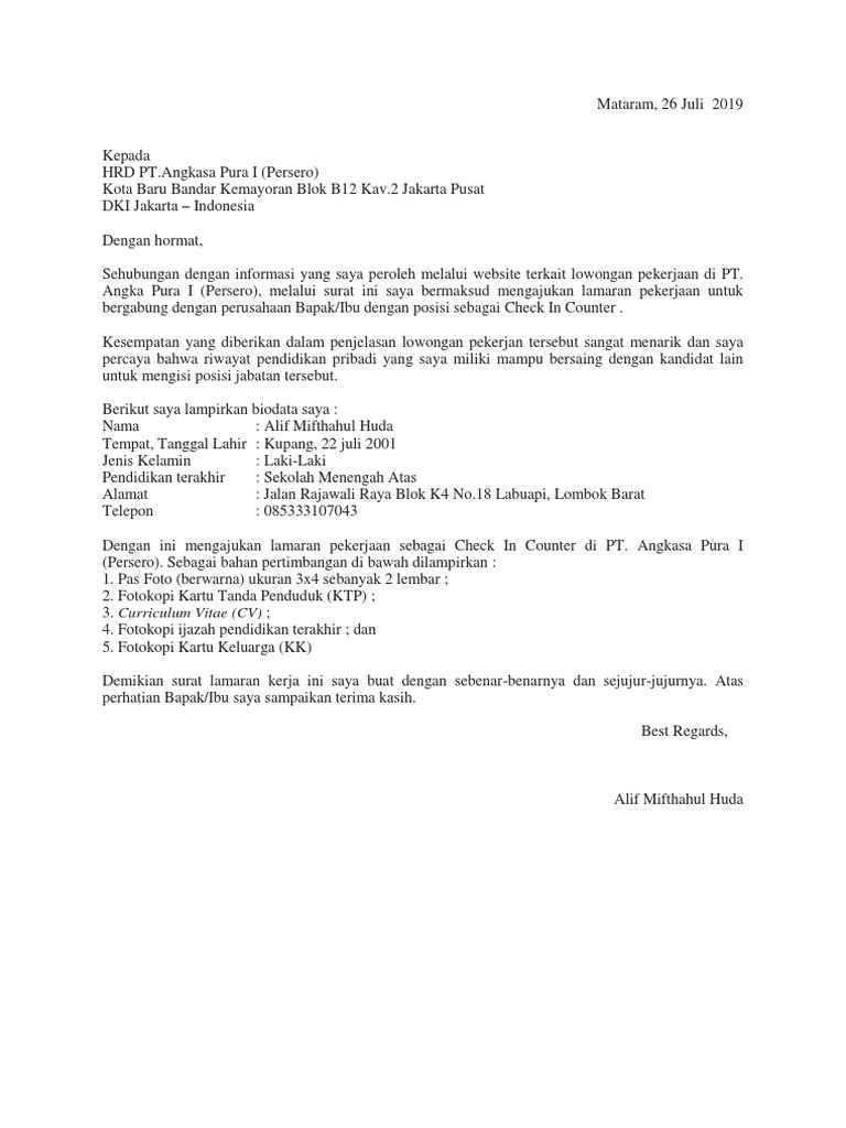 Surat Lamaran Kerja Di Pt Angkasa Pura I Sebagai Check In Counter Pdf